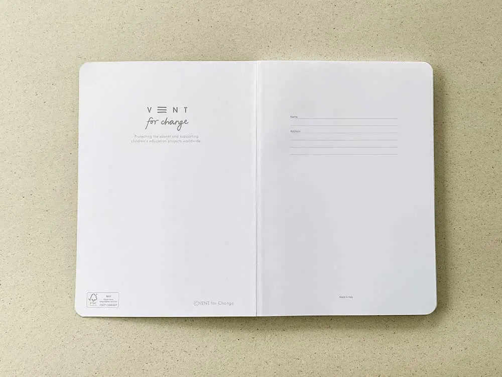 Das Notizbuch enthält 96 Blatt (192 Seiten) aus 80 g/m² Naturpapier (Recyclingpapier), die einfach herausnehmbar sind. Die schwarzen Bezüge bestehen aus recycelter Wolle und recyceltem Karton und das Papier ist nachhaltig zertifiziert.