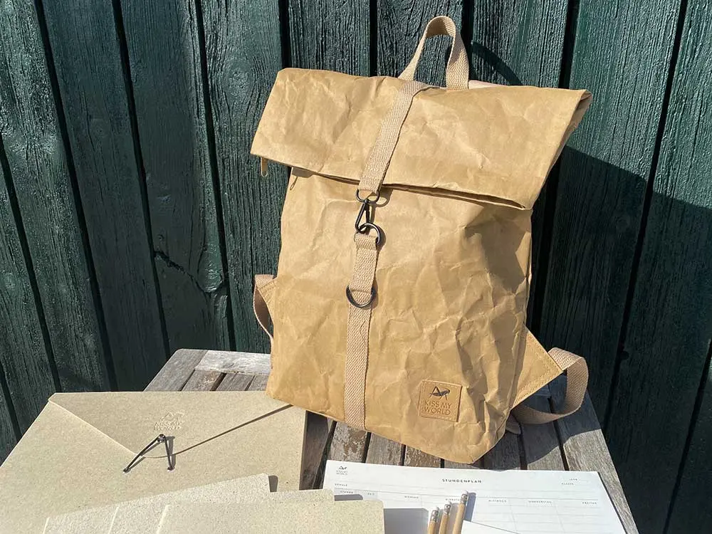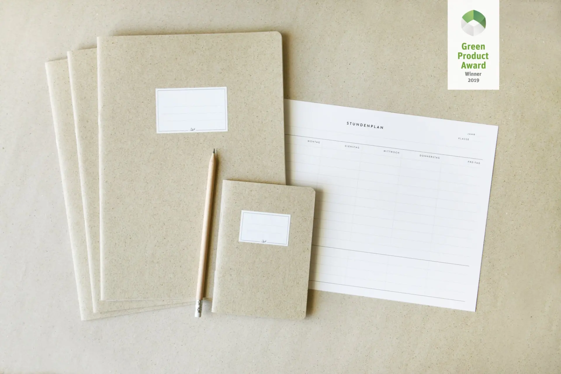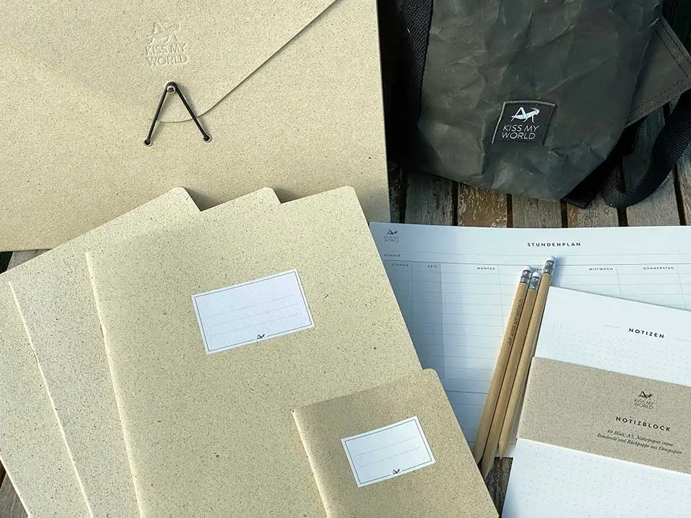 Es enthält einen Rucksack aus Washable Paper (schwarz oder natur), eine Dokumentenmappe A4, einen Notizblock Naturpapier, ein Graspapier Hausaufgabenheft, einen Stundenplan sowie drei Schulhefte und drei Papier à la Carte-Bleistifte aus Naturholz.