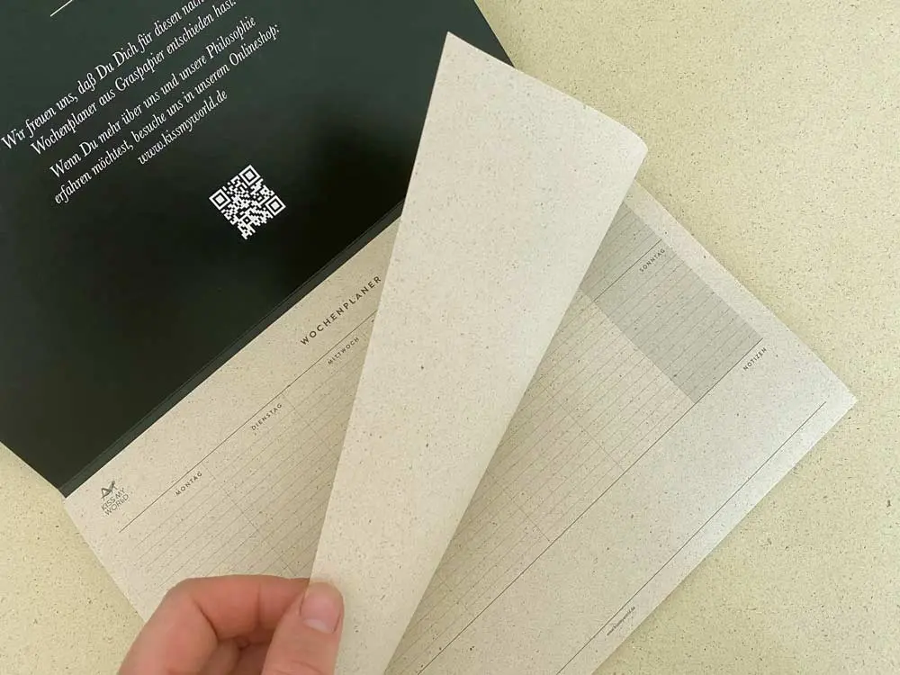 Unser Wochenplaner aus Graspapier bringt mit seinen 50 Seiten im A4-Format Ordnung in Deinen Alltag! Die Seiten des Wochenplaners sind aus Graspapier gefertigt, der Umschlag ist aus Naturpapier. Egal ob im Büro, in der Schule oder einfach für Dein strukturiertes Zuhause: Dein Wochenplaner aus Graspapier ist mit Sicherheit ein treuer Begleiter. Du willst mehr? Hier haben wir noch einen praktischen Jahresplaner für Dich!